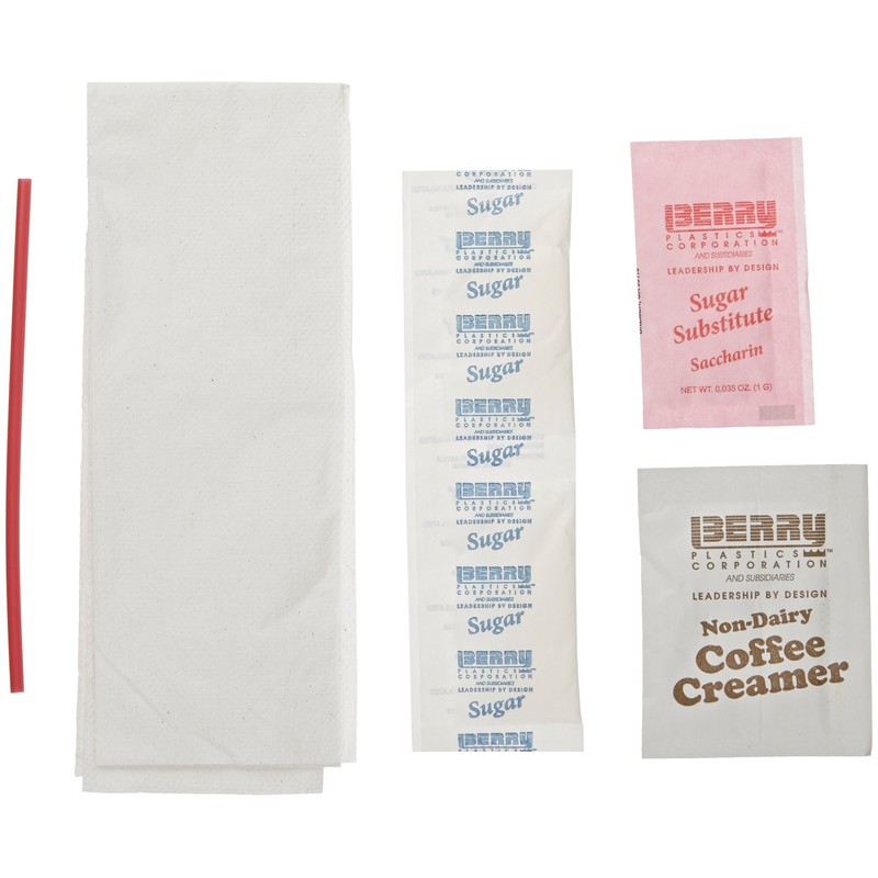 - Condiment kit contains a paper napkin, a plastic stirrer, two sugar packets, one sugar substitute packet, and one packet of nondairy creamer, and is suitable for use with coffee and other beverages