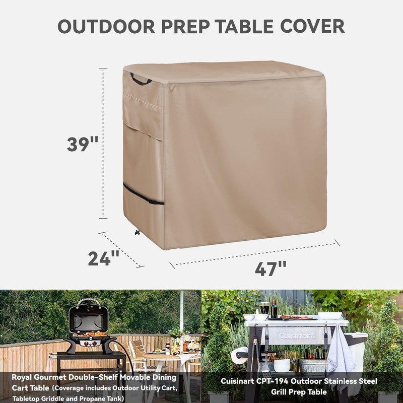 Product Highlights:*Made of top quality 600D polyester Oxford cloth complex with waterproof backing.*Tough enough to keep rain, hail, snow, dust, leaves and bird droppings away.*100% coverage design avoids the exposure of furniture in the sun makes your Movable Dining Cart Table always look like new.*Perfect to protect your prep table away damage from nature elements.