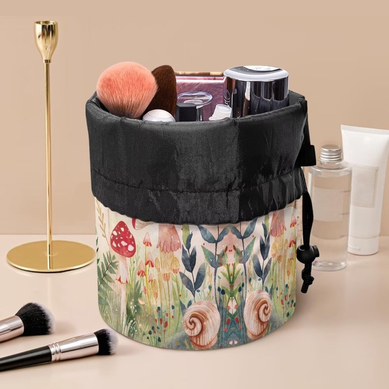 Wnbucioht Mushroom Drawstring Cosmetic Bag for Women Travel Toiletries Bags Portable Drawstring Wash Bag Butterfly Mushroom Print Barrel Makeup Pouch Large Capacity Open Flat Toiletry Bag