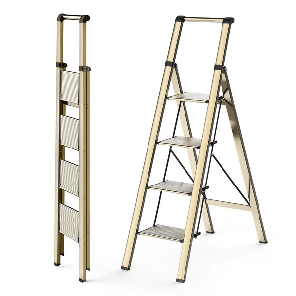 WOA WOA 4 Step Ladder, Ladders for Home, Anti-Slip Pedals, Aluminum Step Stool Foldable, Lightweight to Move, Ease of Storage, Reach 9ft for Closet Kitchen Library, Hold 300lbs - Gold