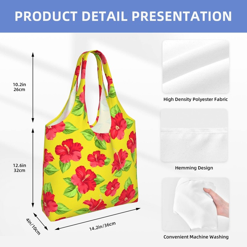 WOAIDY Hibiscus Flower Reusable Grocery Bags, 50lbs Foldable Durable Shopping Totes With Handles Large Washable Bags