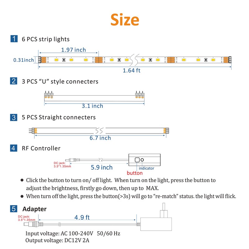 - DIY LED light strip: 6 PCS pre-cut strips, total 9.8ft, many kinds of connection option, Great way to upgrade your cabinets, closet, desk, TV back, bookshelf, bed, wardrobe, cupboard, counter, display case etc