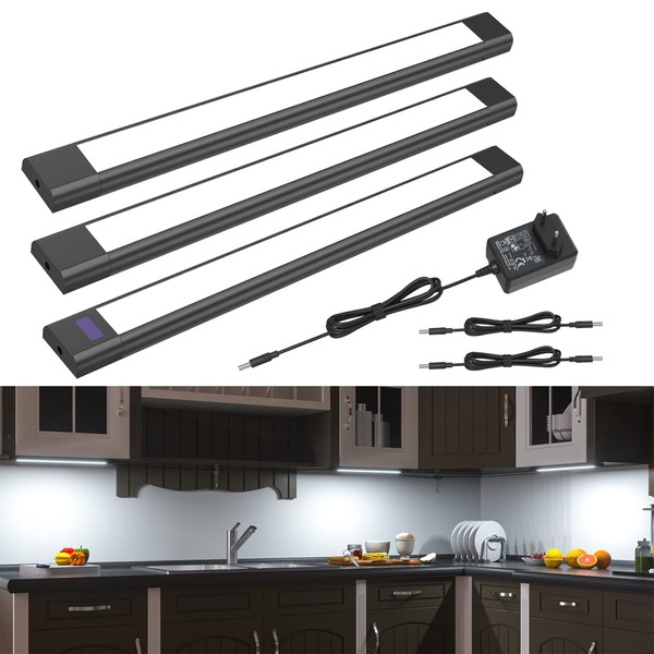 WOBANE Under-Unit Light Kitchen LED Dimmable, Hand Motion Activated, Bright Light Strip with Sensor, 3 x 30 cm LED Kitchen Lighting Under-Unit, Cool White Base Cabinet Lighting for Shelves, Wardrobe,