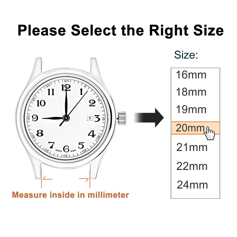 - Band Width (Size): Standard 16mm, 18mm, 19mm, 20mm, 21mm, 22mm. This watch band is compatible with all watches (including smart watches) with above band width. To determine the right size, use a ruler measure the interior distance between the two lugs on the watch case.