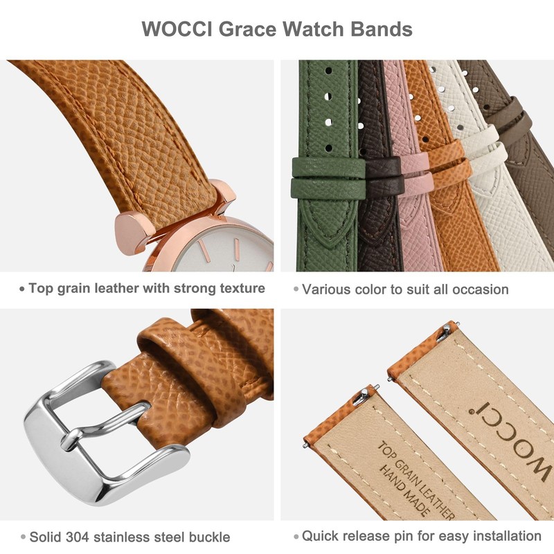 WOCCI 20mm Grace Leather Watch Band for Ladies, Top Grain Leather, Quick Release Replacement Strap with Silver Buckle (Apricot Tan)
