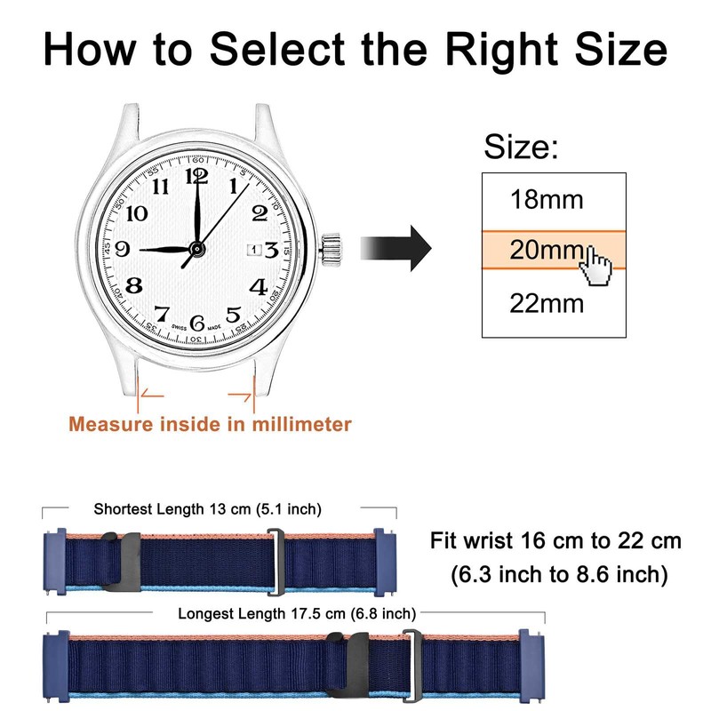 - Band Width (Size): Standard 18mm, 20mm, 22mm. This watch band is compatible with all watches (including smart watches) with above band width. To determine the right size, use a ruler measure the interior distance between the two lugs on the watch case.