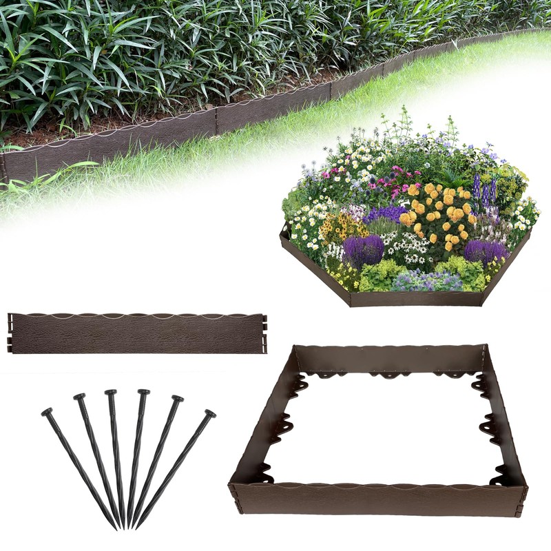 WOCHOLL Garden Edging Border Wood Look Fence Landscape Edging, 2.3 Inch Tall Edging for Landscaping with Spikes, Paver Edging for Flower Bed Edging Lawn Border (Brown, 20FT)
