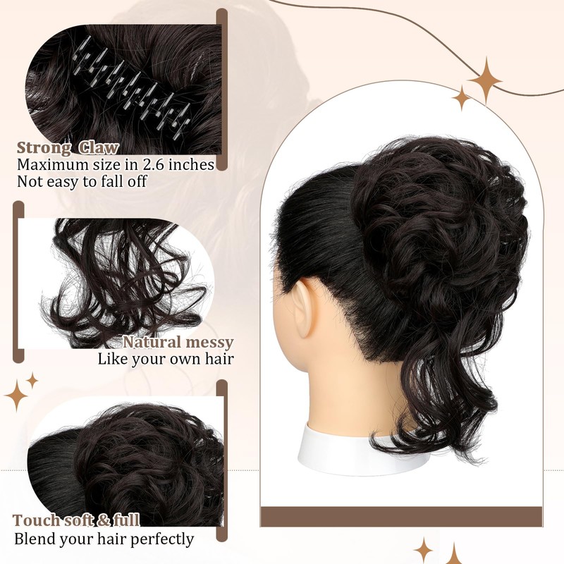 Wodelanle Claw Clip Messy Bun Hair Piece for Women - Wavy Curly Chignon, Ponytail Hairpieces, Tousled Updo Extensions, Scrunchie for Daily Use - Dark Brown Mix Light Auburn