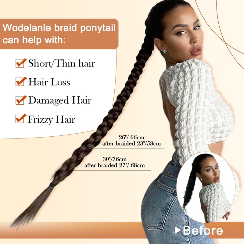 - 【Instant Length】How to easy get a satisfied ponytail? Try Wodelanle long braided ponytail hair extensions now!Adding instant length and volume to your hair at once. Braided warp ponytail extenison is 30 inch long and weight is160g/pcs, not too heavy for a more comfortable wearin The latest braided ponytail extension bring you a stylish look, effortlessly switch up your look and styleNo burden for all-day use