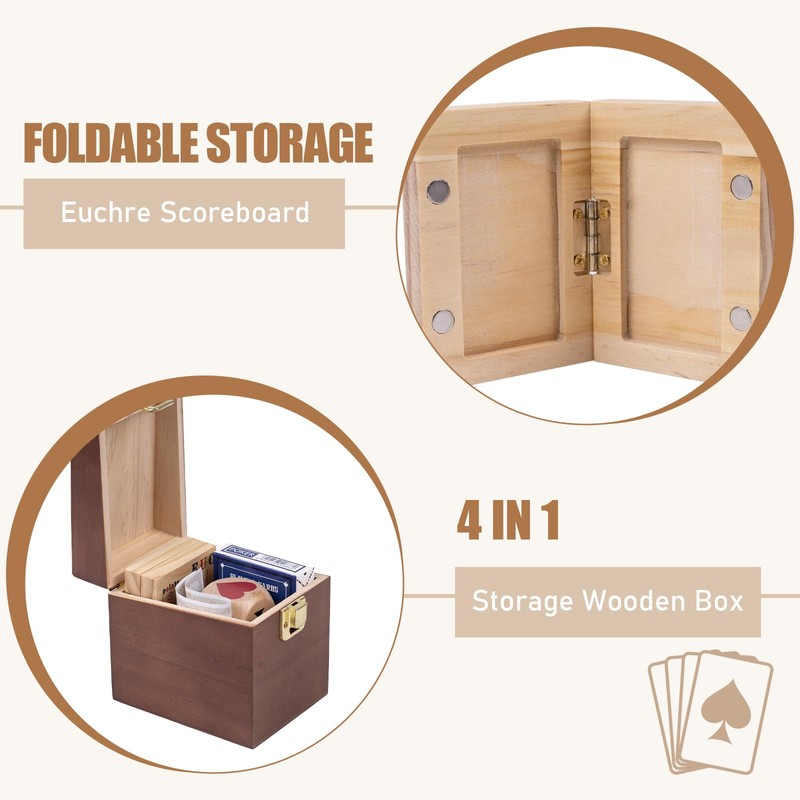 - 【Complete Accessories】 Euchre Card Game Set Include:Double euchre cube,foldable euchre scoreboard,A deck of playing cards,Exquisite wooden storage box.Complete game accessories are suitable for beginners to learn.