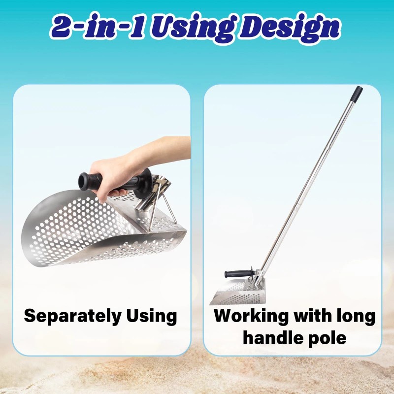 【ENHANCE YOUR METAL DETECTING EXPERIENCE】 2-in-1 Design: Use as a Standalone Sand Scoop or Pair with an Extension Pole. Featuring an added long-handle design that is detachable to meet different height requirements, it allows you to maintain a standing posture while working, eliminating the need to bend or squat.