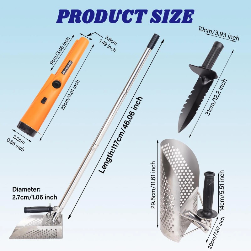 【SAND SCOOP FOR METAL DETECTING】This metal detector accessory kit includes 1x sand scoop, 1x Metal Detecting Shovel, 1x Metal Detecting Pinpointer ,One pair of gloves. Crafted from durable 304 stainless steel, this sand shovel ensures rust-free performance for prolonged use at the beach.