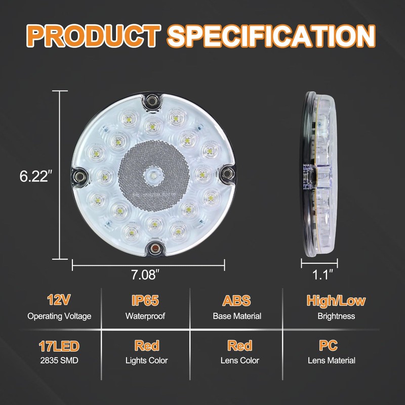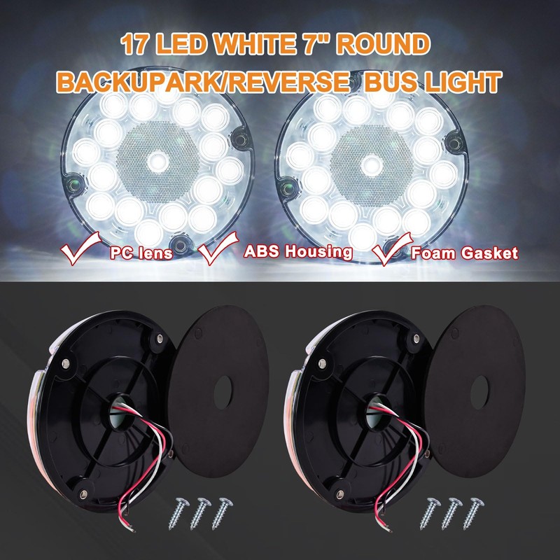- [Easy Installation] This listing includes 2Pcs 17 LED white 7" Round Backup/Reverse/Running/Marker Light Bus Light; 7" Diameter x 1-1/18" deep; Designed for 10-volt to 30-volt systems; Surface mount to trailer with mounting gasket; 3-Wire design hardwires to trailer; 4-hole surface mount with Inner reflectorized lens; Hole to Hole Mounting Space: 6-1/4" Inch;Wire Connection Tips: White Wire - Ground, Red Wire - high power , Black Wire - low power;