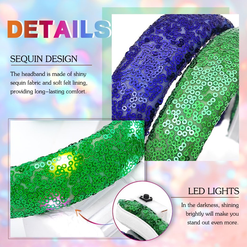 - Sequin hairband is made of sparkly sequin fabric with light up design, lightweight and comfortable to wear, non slip.Color:royal blue and green.