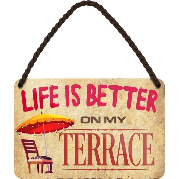 WOGEKA ART HS958 Retro Tin Sign - Life is Better on My Terrace - Funny Saying as a Gift Idea for Veranda Owners for Birthday Christmas as Decorative Sign 18 x 12 cm Metal Hanging Sign