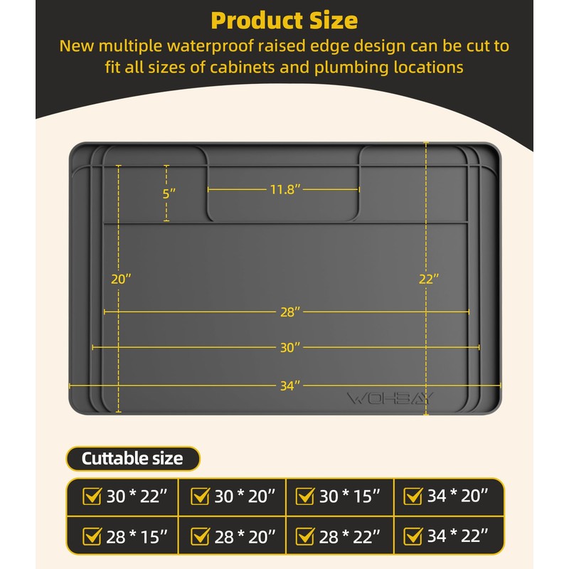 - One fits more: Innovative cuttable design for any plumbing location. The sink mat measures 34" * 22" and is compatible with standard 36" wide sinks, and can be cut along the height increase line to 30" or 28" wide and trimmed to 20" or 15" deep.