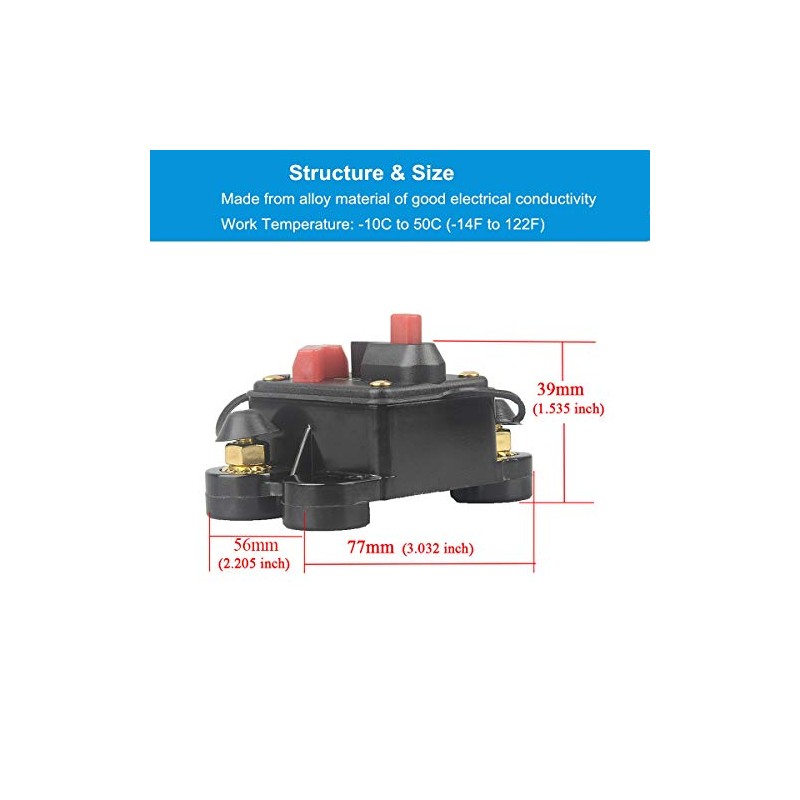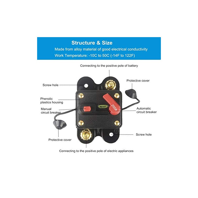 WOHHOM 30A 50A 80A 100A 150A 200A 250A 300A Circuit Breaker Reset Fuse Switch For Car Audio Marine (250A)A safe and convenient breaker for circuit of car stereo or large car electric appliance.Why need buy this circuit breaker?A: It can offers critical protection to your system -- No More Spending Money on Replacing Fuses.Suitable for car audio/video system, Boat, trucks, buses, RV's, ATV Winches and marine and DC sound amplifier system overload protection.Feature:1) Protect electrical appliances from excessive current.2) Made from alloy material of good electrical conductivity.3) High Tech water resistant housing.4) Manual control and easy to operate with manual reset arm5) Unique push button Reset can also be used as a kill switch.6) Mount on Panel or Firewall.7) Rubber Boots for water protection.Specification:Ampere: 250A.Models: 30A 50A 80A 100A 150A 200A 250A 300A (Optional).Voltage: 12-24V DC.Size: 3.4in (L) x 2.2in (W) x 1.5in (H).Material: Plastic + metal.Work Temperature: -10C to 50C (-14F to 122F).Package Includes:1 x 250A Circuit BreakerNote:1) Please shut down power before your replacement.2) Please correctly push the button to avoid damage the Circuit Breaker.3) Please order and use the Circuit Breaker with right work temperature, to avoid it is too heat and stop work.