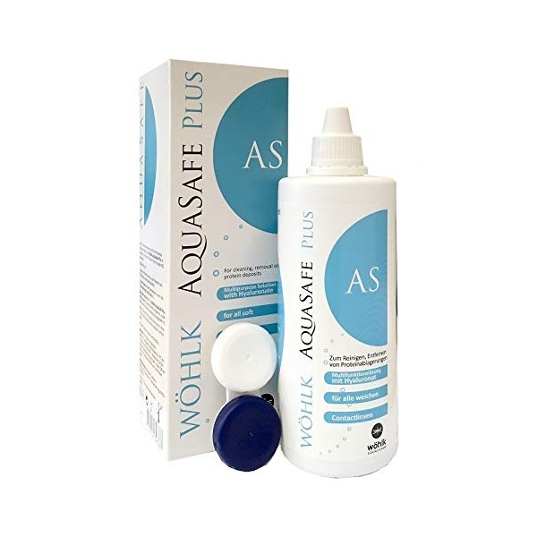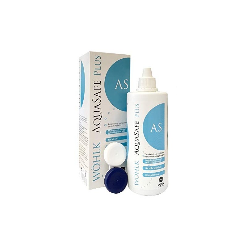 Wöhlk Aquasafe Plus particularly effective combination solution with wetting agent for the care of hydrogel and silicone hydrogel soft contact lenses. Improved Plus version: double disinfection system based on PHMB and polyquaternium - additional comfort thanks to hyaluronate - active protein and fat removal - without animal and toxic ingredients Composition: active ingredients: polyquaterium, hyaluronate preservative: polyhexamethylene gluanide (PHMB) 0.0002%