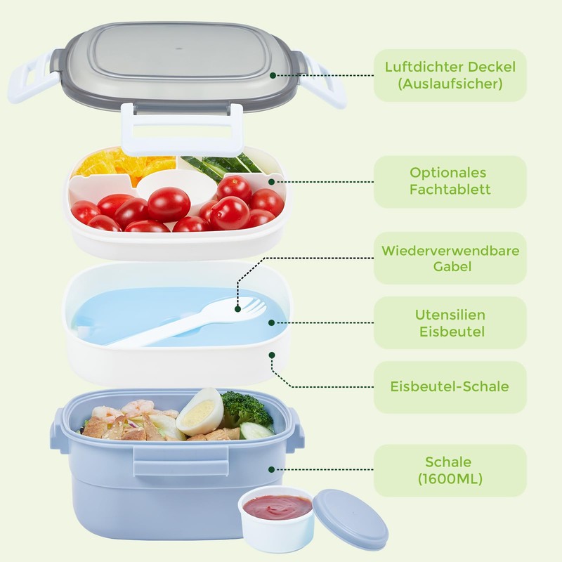 Wohntec Salatbehälter Bento Box, 1600 ML Salatbox für Erwachsene Kinder mit Kühlakku, Göffel und Dressingbehälter, 4 Fächern Lunchbox, Auslaufsicher Brotdose für Schule Büro Picknick, Blau