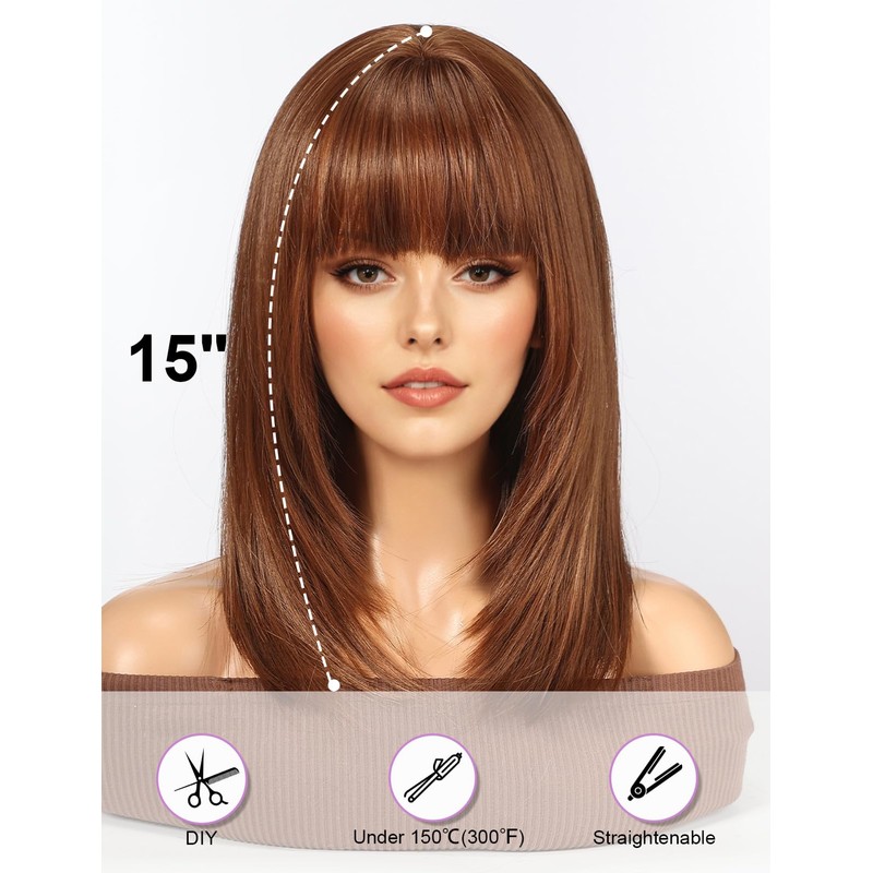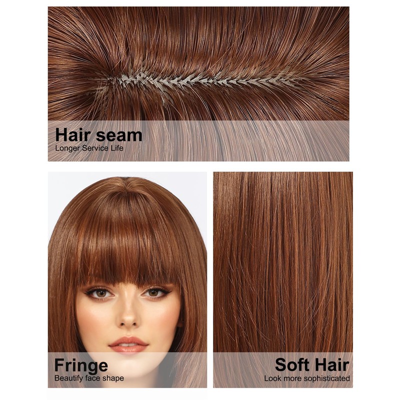 WOKESTAR Staright Wig with Fringe Synthetic Mid-length Layered Wigs for Women Auburn Color