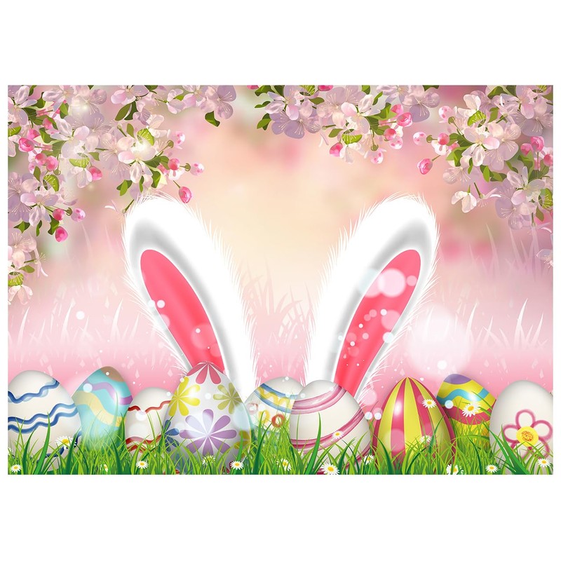 WOLADA Easter Backdrop Pink Easter Backdrop Rabbit Ear Easter Egg Backdrop Children's Easter Grass Easter Egg Backdrop 8x6FT FW89