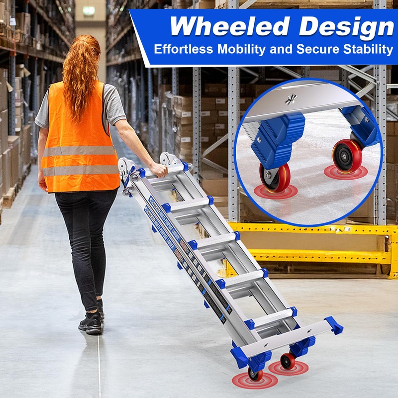 - Pro-Grade Folding A-Frame Ladder:Reach 17FT with exceptional stability at a mere 29.1lbs weight. Integrated 360° swivel wheels for easy mobility. Compact foldable design. Compatible with work platforms (sold separately) for convenient tool placement