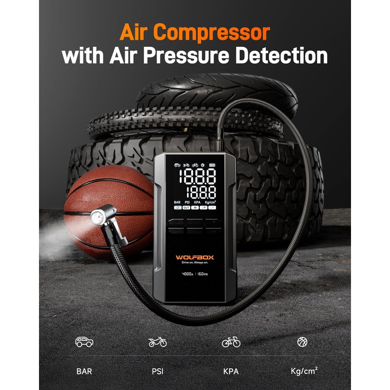 WOLFBOX 4000A Jump Starter with 160PSI Air Compressor, 12V Car Battery Booster, 65W Fast Charge, 24000mAh Portable Tire Inflator, LED Display for 10L Gas & 10L Diesel Engines, LED Light, Jumper Cables