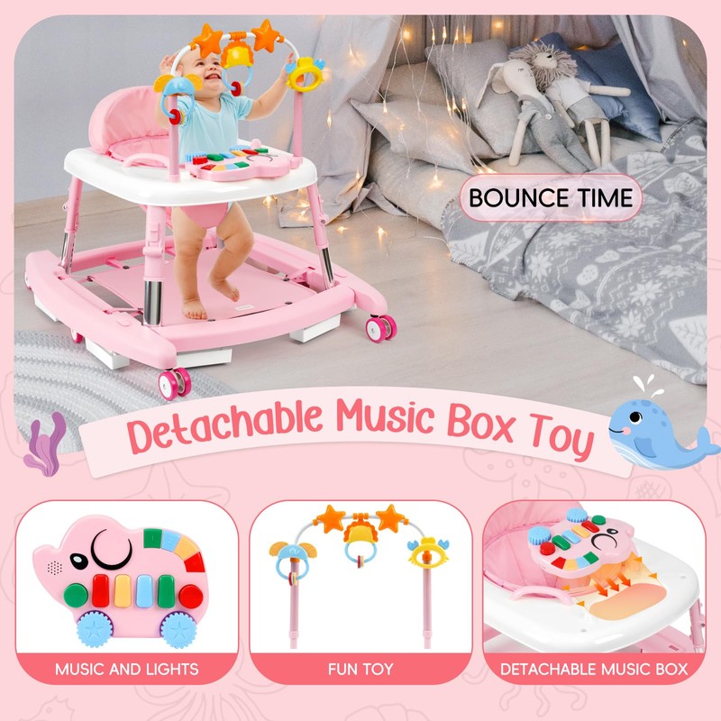 - [5-in-1 Baby Walker Design] : The baby walker has five modes: baby walker mode, bouncing combination mode, rocking chair mode, dining table mode, and hand push mode. Baby walkers meet the exploration and growth needs of infants at various stages from 6 months to 18 months, and do not require complicated installation steps. Moreover, in the pushing mode of the baby walker, the directional wheels can be used, which can increase or decrease the movement speed of the wheels.