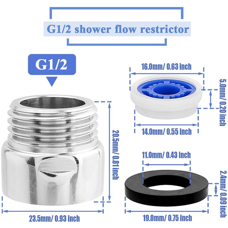 - Universal Fit: The restrictor valve (23.5 x 20.5mm) fits most 1/2-inch threaded showerheads. The inserts (16 x 14 x 5mm) easily integrate with various shower systems for smooth daily use