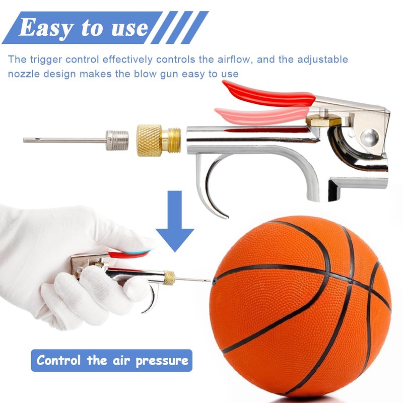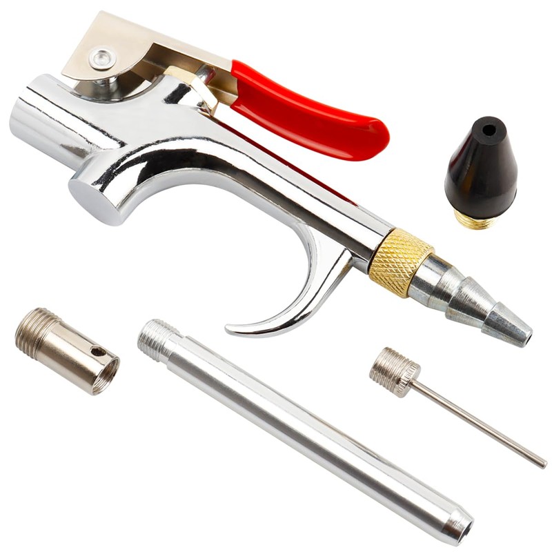 - Air Blow Gun Accessory Kit includes 1x air blow gun, 1x 3” blow gun extension nozzle, 1 x blow gun inflation needle, 1x safety tip blow gun nozzle, 1x pin inflation needle, 1x rubber tip, 1x blow gun adapter