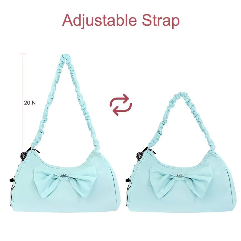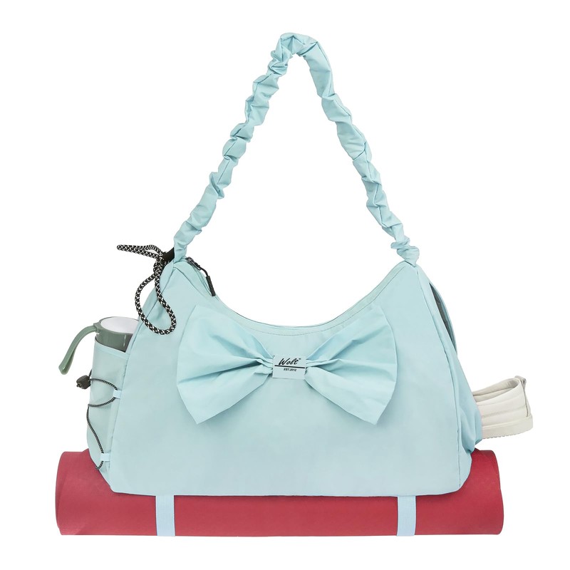 - Removable Bow Pocket: The yoga bag's front bow serves a dual purpose. It adds a decorative touch and enhances the bag's appearance. It can be also detached as a zippered toiletry bag for conveniently storing smaller essentials like Cosmetics,toiletries.