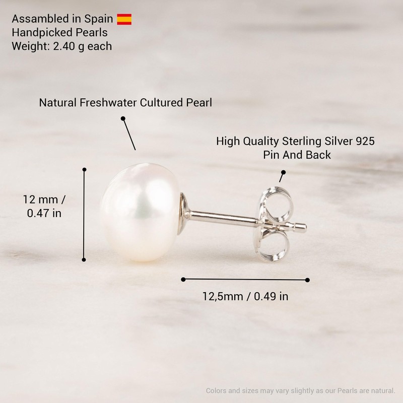 Women and Girls Pearl Stud Earrings. Fresh Water Cultured Pearls Button Shape Secret & You | 925 Sterling Silver Mounts | Available in 10 sizes from 4 mm to 13 mm