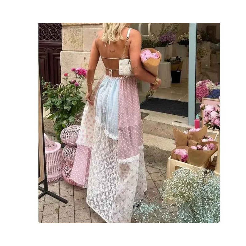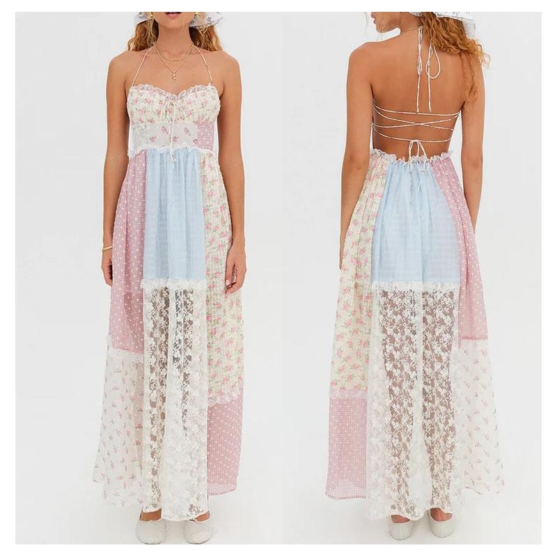 - Design:Patchwork maxi dress for women 2025 trendy, spaghetti strap, sleeveless, backless, A line, ruffle hem, tiered dress for women, 2000s dress for women, gratiffi print sundress for women, beach vacation maxi dress, cocktail party halter neck dress.