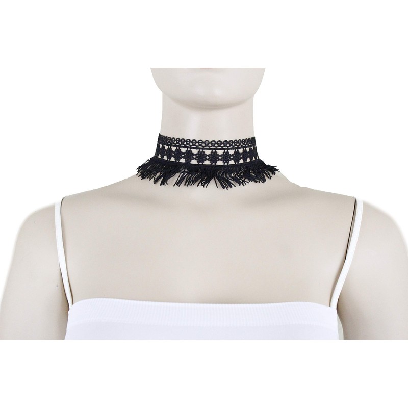 Women Fashion Jewelry Choker Short Necklace Wide Black Lace Fabric Fringes Taeel Goth Party Wear