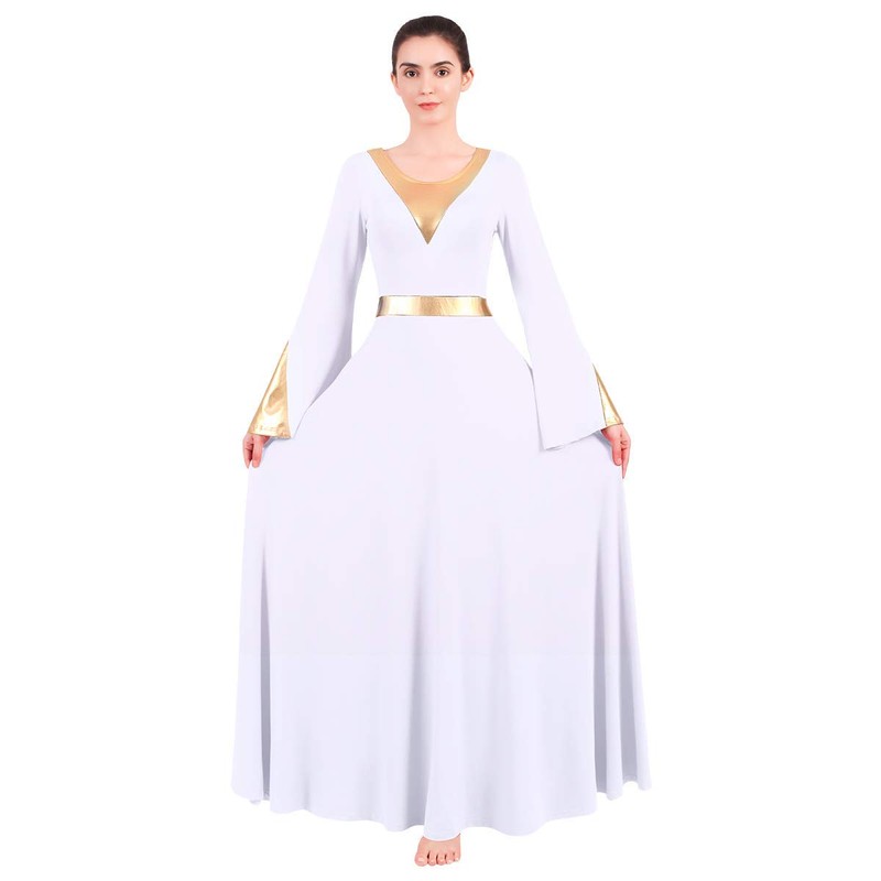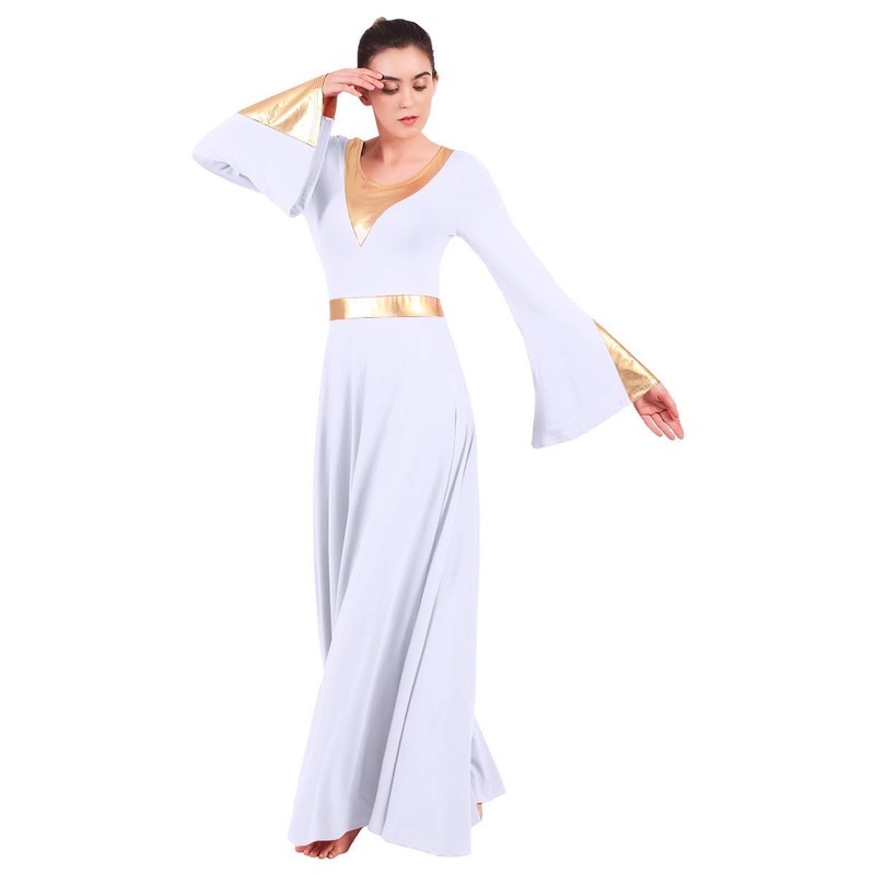 - ♣ CLASSIC PRAISE DANCE DRESS: Elegant women adult girls bell long sleeve liturgical lyrical praise dance dress metallic color block christian church robe dress worship costume, full length ruffled swing tunic skirt gowns, unique contrast color top and full long sweep skirt, loose fit praisewear, show the elegance and beauty of movement, suitable for worship praise dance, modern liturgical dance, ceremonies, ect
