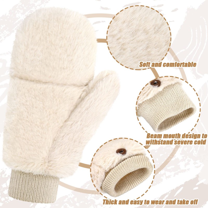 Women Mittens Winter Fur Gloves Flip Cover Gloves with Faux Fur Convertible Warm Flip Top Mitten Soft Fingerless Fur Mittens (Beige White)