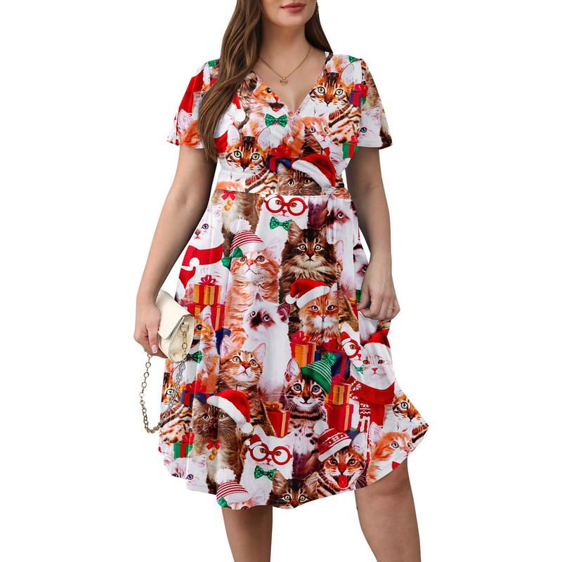 Women Plus Size Christmas Dress — Ugly Xmas Print Holiday Funny Cat Meowy 2024 Wrap V-Neck Short Sleeve Midi Dresses