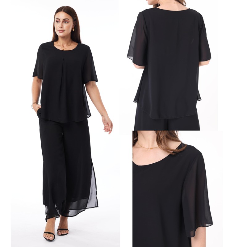 Women's 2 Piece Chiffon Sets Outfits Flowy Ruffle Layers Casual Dressy Wedding Guest Pant Suits Black