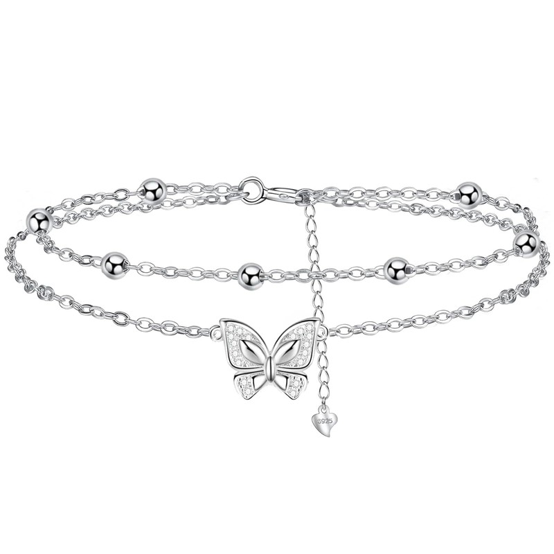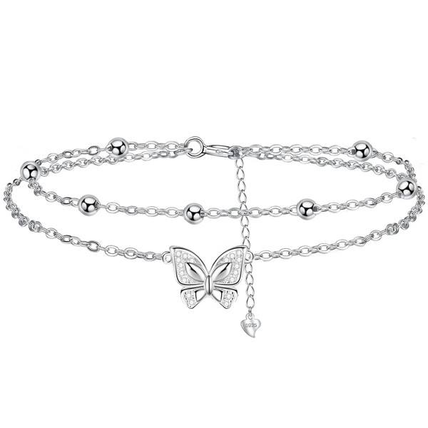 Women's 925 Silver Anklet - Butterfly Layered Anklet - Summer Barefoot Beach Anklet - Adjustable 22 + 4 cm, Sterling Silver