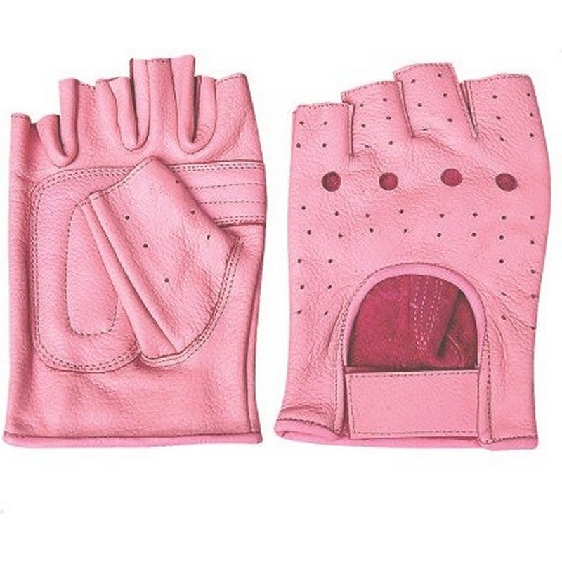 Ladies Pink All leather Fingerless glove with padded palm Velcro strap