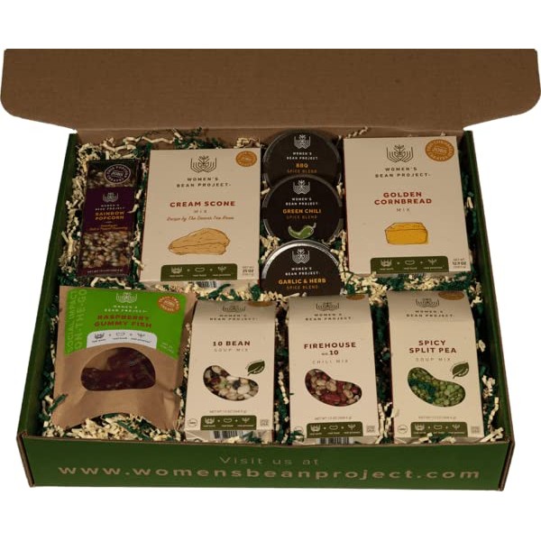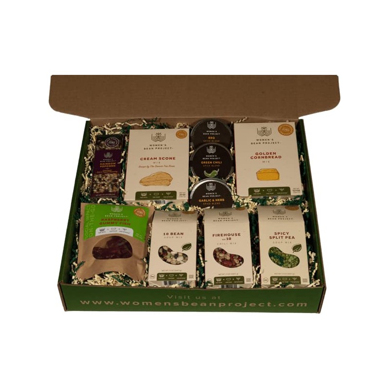 The Sampler Gift Box is aptly named; this large gift box is a complete sampling of the Women’s Bean Project fan favorites. Includes 10 Bean Soup, Firehouse Chili, Spicy Split Pea Soup, Golden Cornbread, Cream Scones, BBQ Spice Blend, Garlic & Herb Spice Blend, Green Chili Spice Blend, Rainbow Popcorn, Raspberry Gummy Fish. Women’s Bean Project gift boxes and packaging are fully recyclable and made from recycled materials.