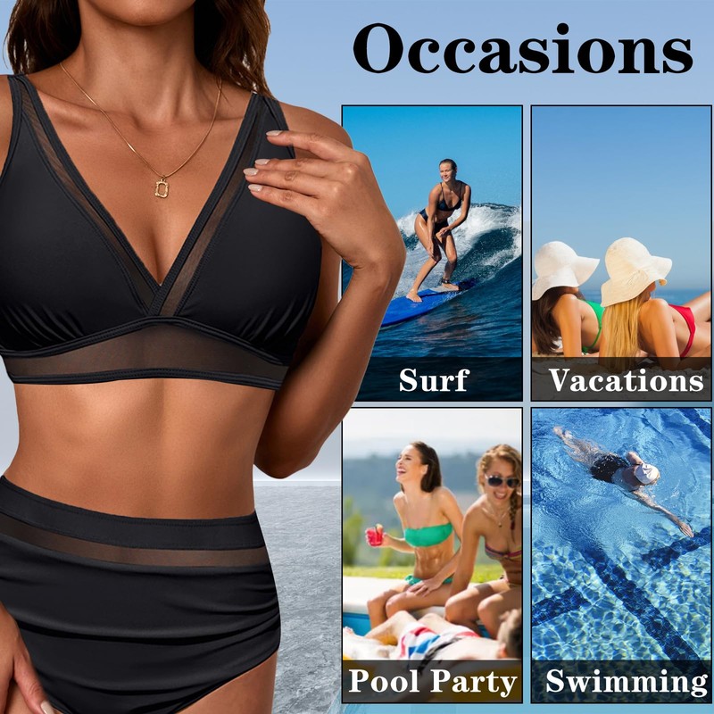 - Unique Design:Featuring a V-neck, pleated design, and a layer of mesh on both the top and bottom, this bikini has a unique look that stands out on the beach. The combination of these elements creates a stylish and eye-catching swimsuit.