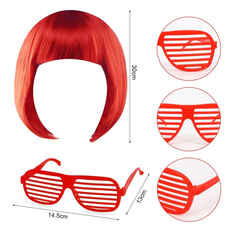 Women's Bob Wig, Carnival Wigs, Short Wig with Neon Glasses and Hair Net, Fancy Dress Wig for Carnival and Theme Party, red