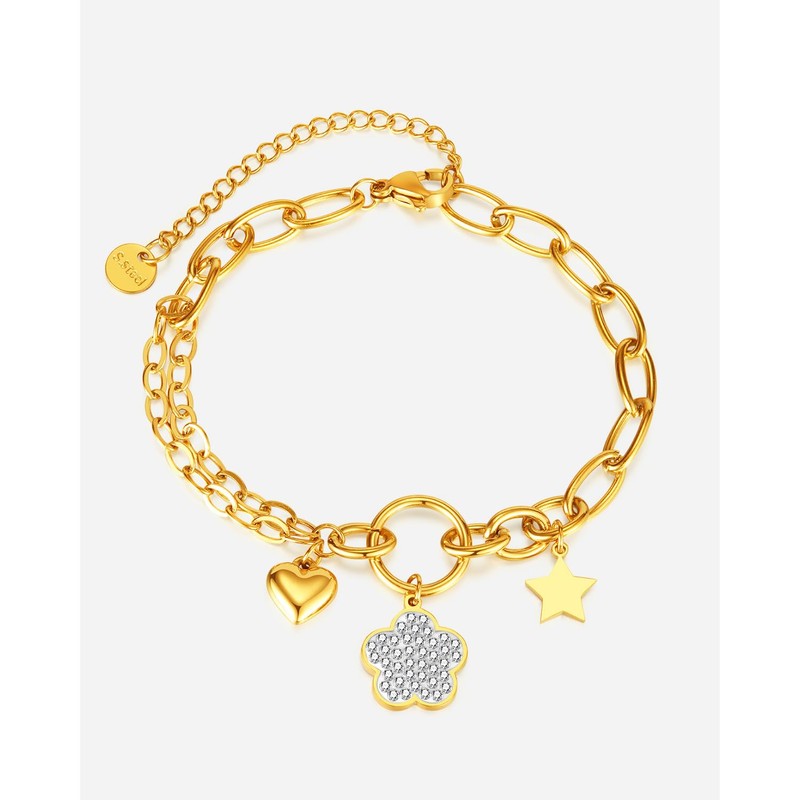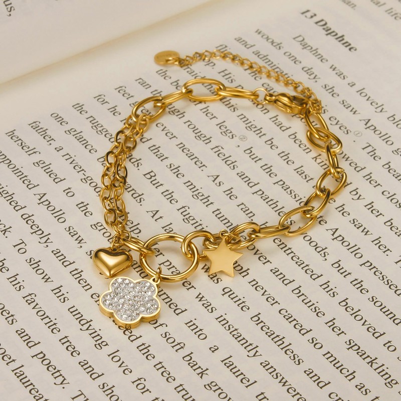 - Deelfel Bracelet: Women's Heart Gold Clover Curb Star Zirconia Star Double Row Chain Heart Material: Stainless Steel; Size: Chain Length: 6.5 x 2.2 inches (165 x 55 mm); Weight: 0.2 oz (7 g)