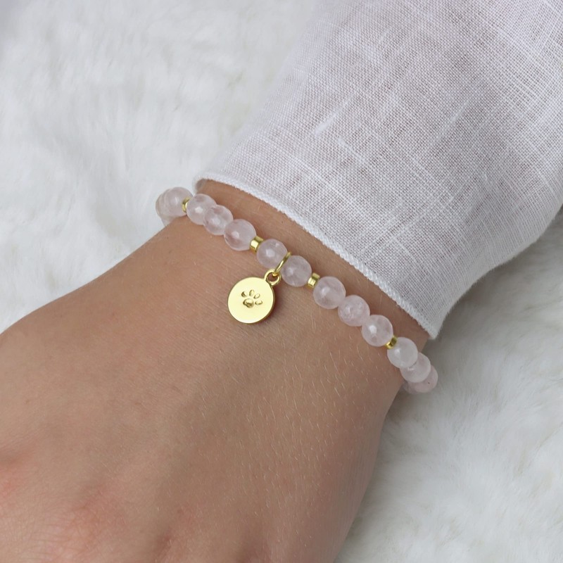 Women's Bracelet Made of Real Rose Quartz, Dog Paw Pendant 925 Silver or Gold Plated Beautiful Gift for Dog Lovers (Quartz)