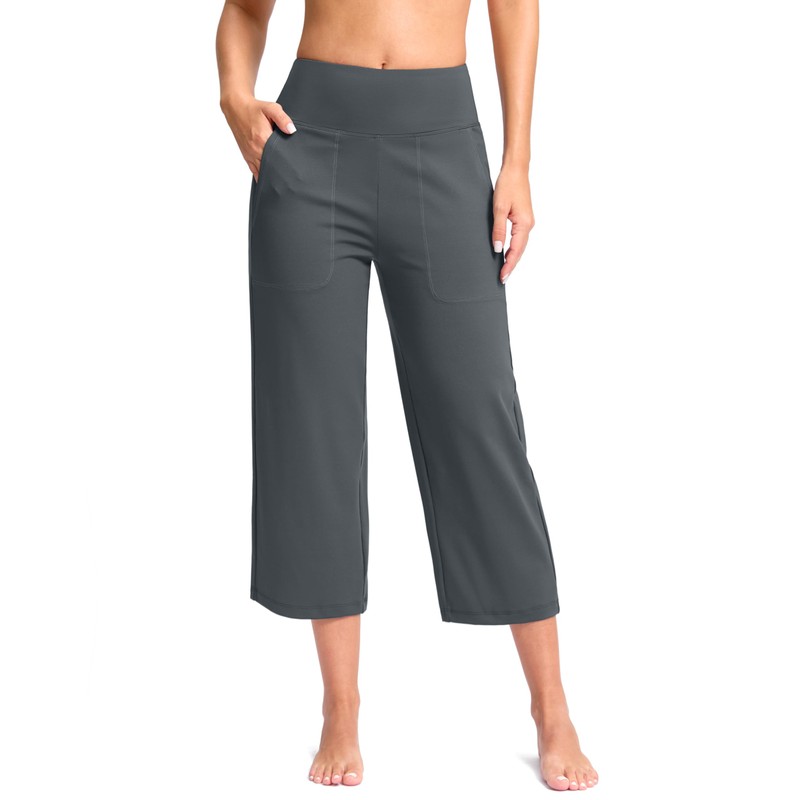 Women's Capri Pants with Pockets High Waist Yoga Pants Wide Leg Workout Crop Summer Pants for Casual, Travel, Exercise(Dark Grey, XL)