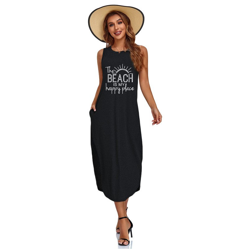 Women's Casual Beach Summer Dresses Sleeveless Graphic Long Sundress Cover Up Dresses with Pocket Black Small