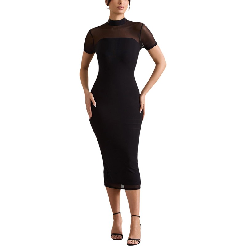 Women's Casual Mesh Elastic Double Layer Mock Neck Short Sleeve Keyhole Back Slit Midi Bodycon Dress Black
