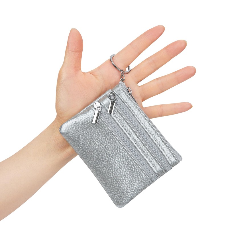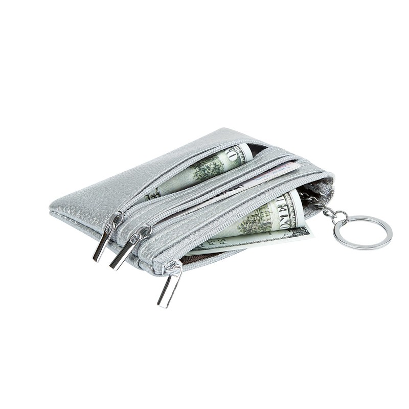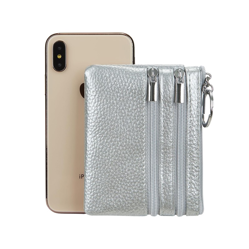 Women's Genuine Leather Coin Purse Mini Pouch Change Wallet with Keychain, Silver