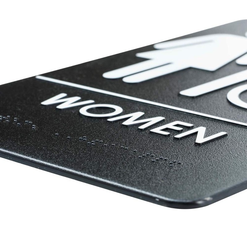 - SIGN DIMENSIONS: Our women’s bathroom wall mounts are 6 inches wide and 9 inches long: The rounded corners are essential for avoiding any injuries when people come into contact with the sign: The white ink on the black, plastic signs makes the text and images totally discernible: The braille makes them great for all guests: Set your bathrooms apart with the Rock RidgeTM bathroom signs